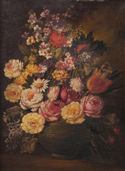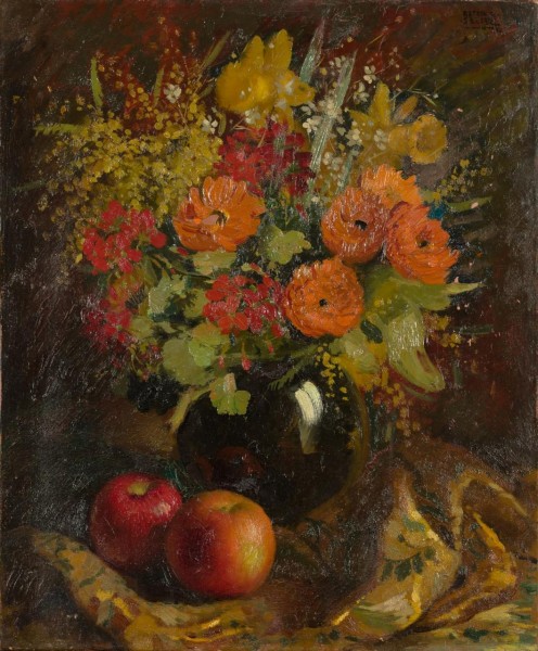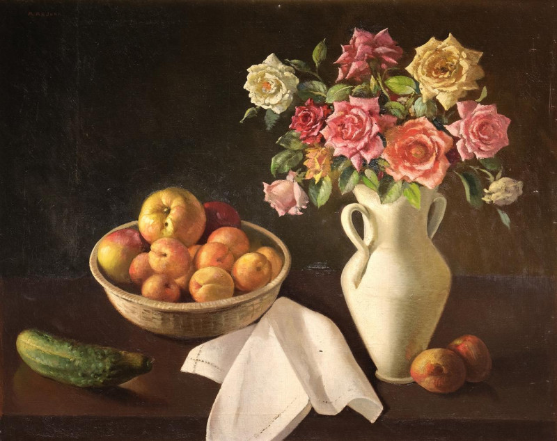 Bodegón con frutas y flores