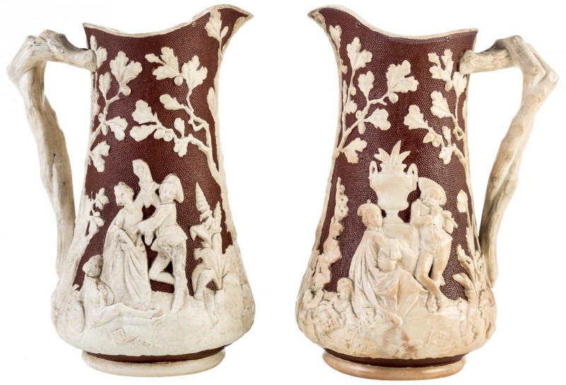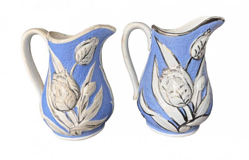 Pareja de jarras victorianas de James Dudson en cerámica esmaltada en azul y plateada sobre blanco con decoración de tulipanes. Inglaterra, hacia 1860.