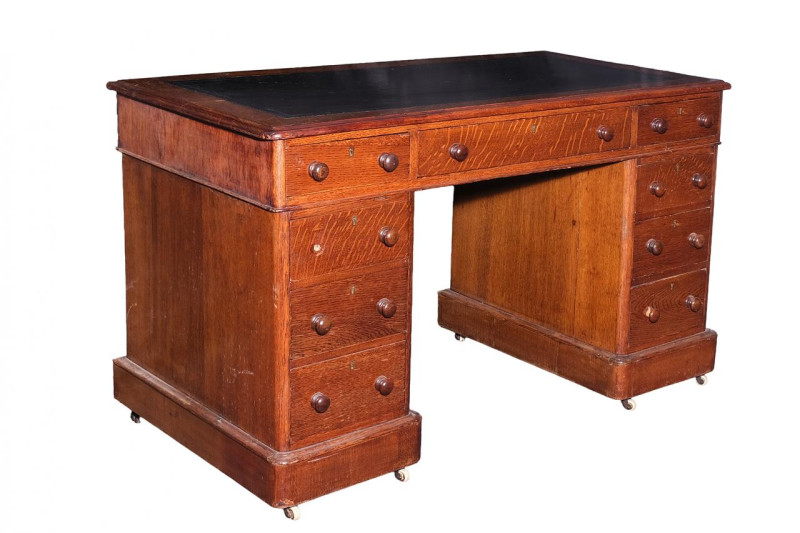 Escritorio en madera de doble pedestal con tres cajones a cada lado y tres en cintura y sobre en piel verde con bordes labrados en dorado. Inglaterra, S. XIX - S. XX