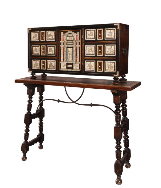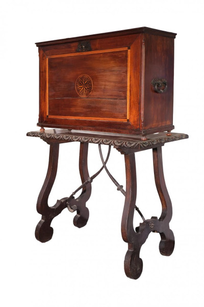 Bargueño con tapa abatible con decoración en marquetería representando una estrella y asas laterales en hierro forjado. España, S. XVIII