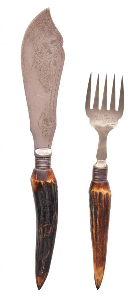 Juego de cubiertos de trinchar compuesto por cuchillo y tenedor en plata contrastada con decoración grabada de hojas de acanto y mango en asta de ciervo. Inglaterra, Fns. S. XIX - Ppio. S. XX