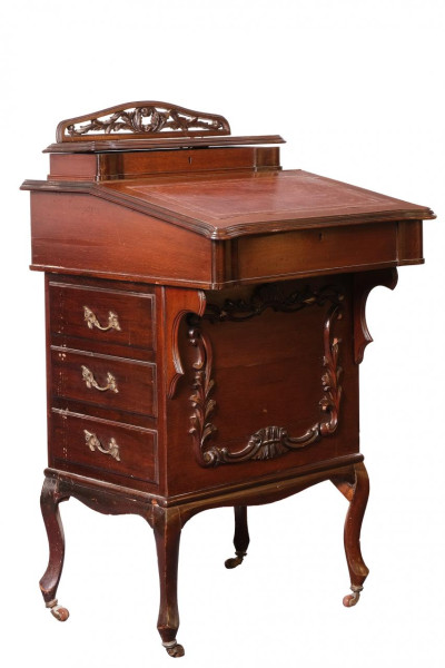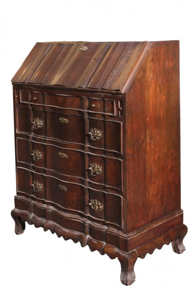 Escritorio / Bureau de estilo inglés de líneas sinuosas siguiendo modelos del S. XVIII con tres cajones que ocupan todo el frente y tapa abatible en la parte superior. S. XIX