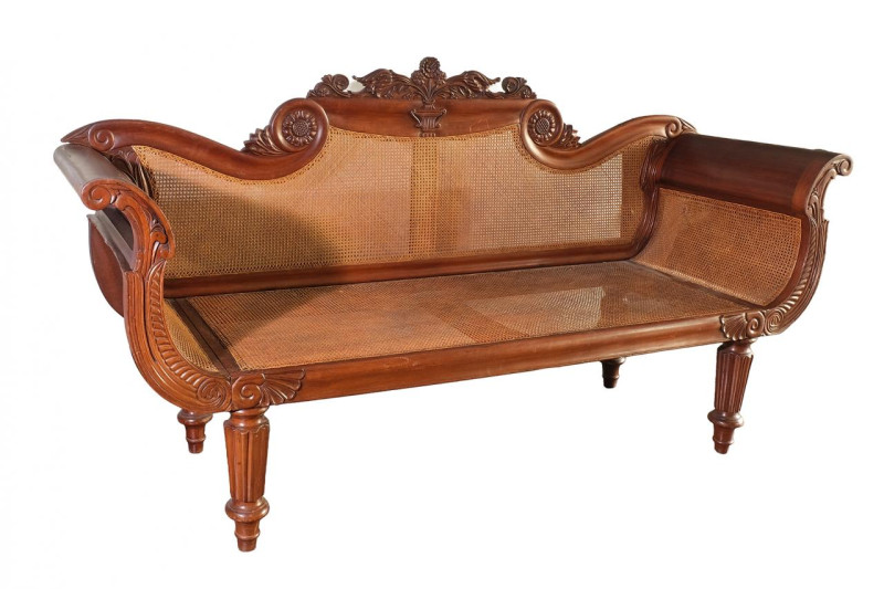 Sofá fernandino en madera tallada con respaldo de copete mixtilíneo y brazos en góndola con decoración de hojas de acanto, tornapuntas y flores sobre pies torneados. España, primer tercio del S. XIX