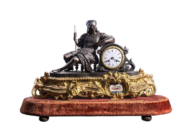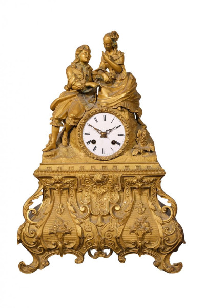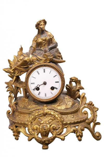 Reloj de sobremesa de estilo Luis XV en calamina dorada rematado por alegoría al verano. Francia, Fns. S. XIX