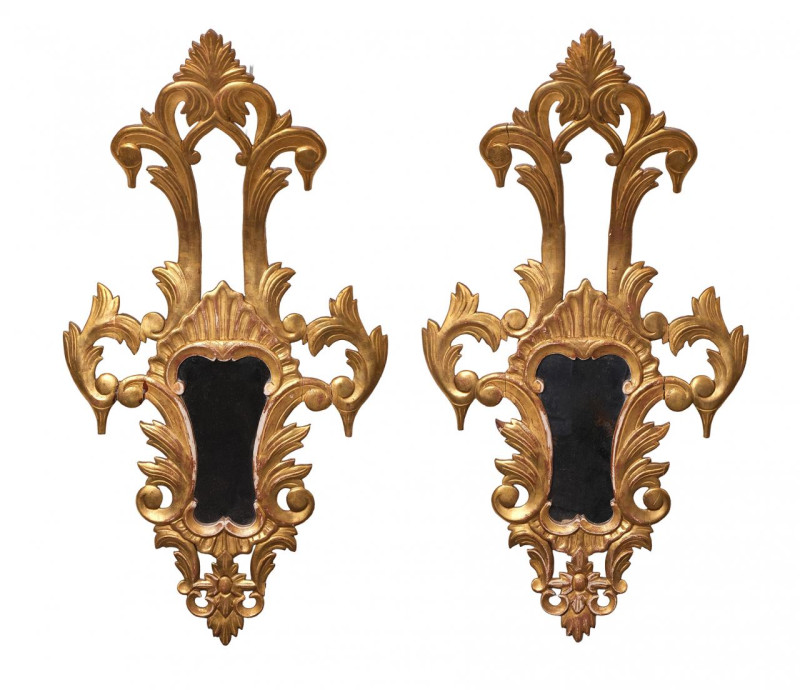 Pareja de cornucopias con marco en madera tallada y dorada con decoración de hojas de acanto. España, S. XIX