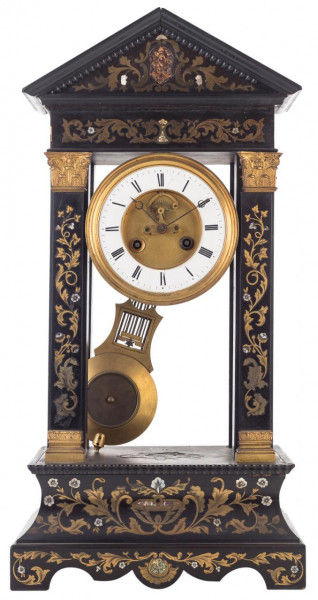 Reloj de tipo "pórtico" en madera ebonizada y marquetería boullé con motivos florales. Esfera en porcelana y números romanos. Francia, S.XIX.