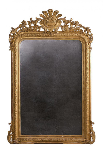 Gran espejo isabelino en madera tallada, estucada y dorada. Decorado por sucesión de molduras con roleos, rocallas y motivos florales con gran copete rematado por acrótera. España, S. XIX.