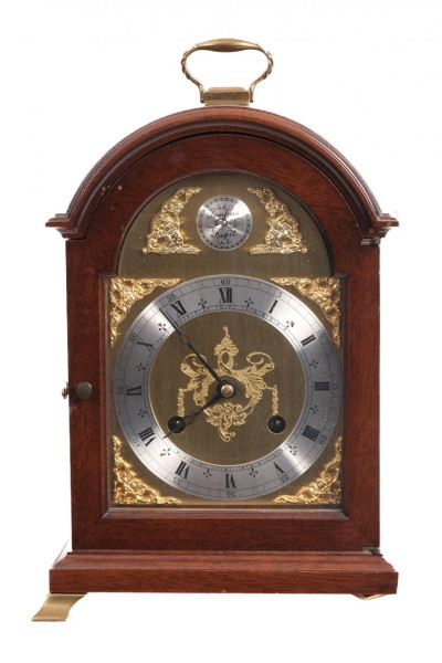 Reloj braket "Tempus fugit" con sonería en madera de caoba con esfera de números romanos en metal. Inglaterra, S. XX.