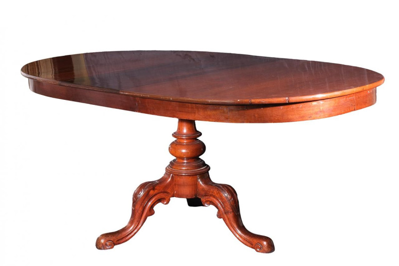Velador victoriano convertido en mesa de comedor en madera de caoba con tablero oval sobre pata central torneada rematada en tres pies con decoración tallada. Inglaterra, S. XIX