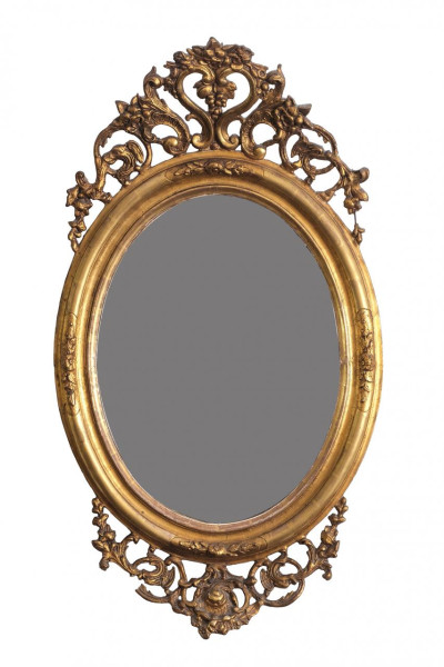 Espejo isabelino de forma oval con marco en madera moldurada, tallada y dorada con decoración floral y roleos de hojas de acanto. España, 2ª mitad del S. XIX