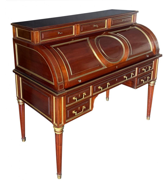 Comodín de estilo Luis XV en madera de raíz y plumeado con decoración frontal de marquetería con cesto de flores y escudo en el sobre bajo corona de marquesado. España, S. XIX