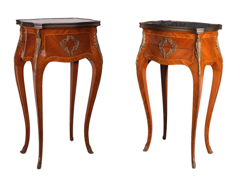 Pareja de mesitas auxiliares de estilo Luis XV en madera con decoración plumeada, dos cajones en cintura, sobre en mármol verde y guarniciones en bronce dorado. S. XX