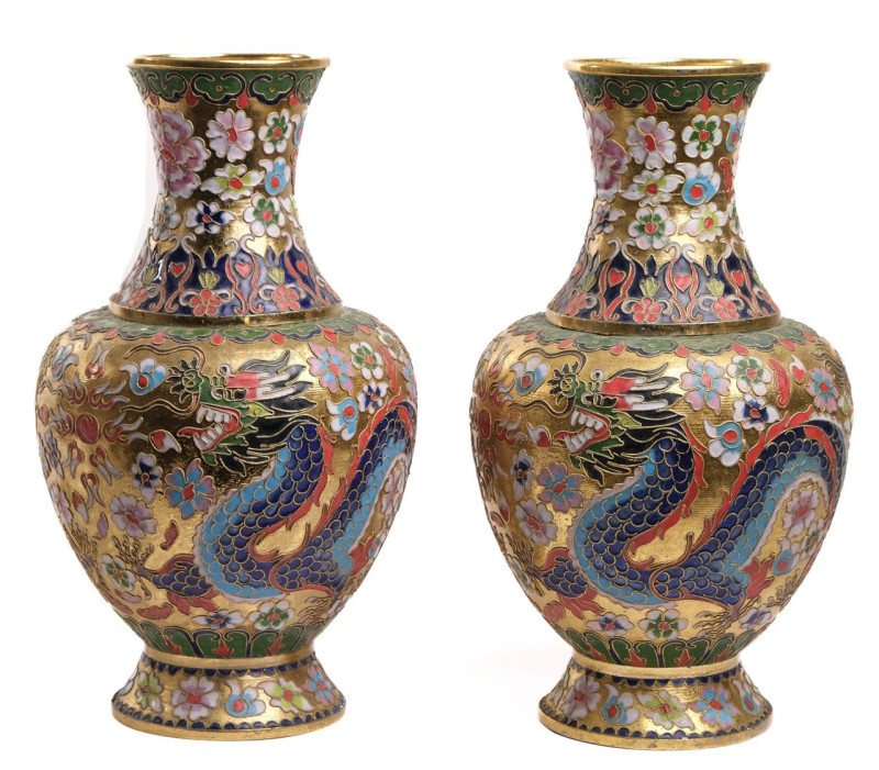 Pareja de jarrones chinos con esmalte cloisoné decorado por motivos florales y dragones. S. XX.