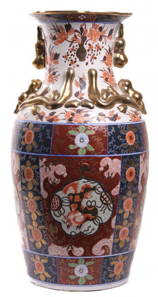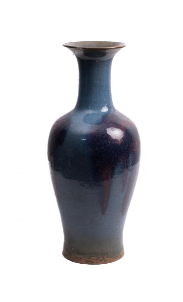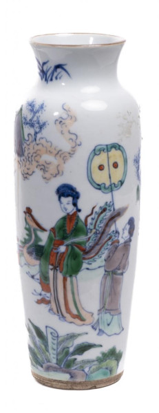 Jarrón en porcelana con cartelas azules con personajes sobre fondo blanco. China, probablemente dinastía Qing (época Kangxi ¿?)