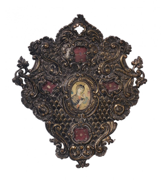 Relicario en metal plateado con repujada de rocalla y hojas de acanto con imagen central de Icono acompañado por cuatro reliquias. España. S. XIX