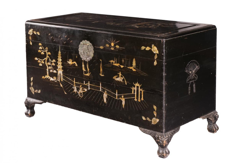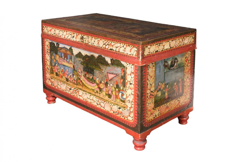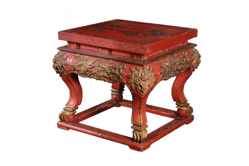 Mesa auxiliar oriental en madera tallada y lacada en rojo con decoración de paisajes en dorado. China, S. XIX