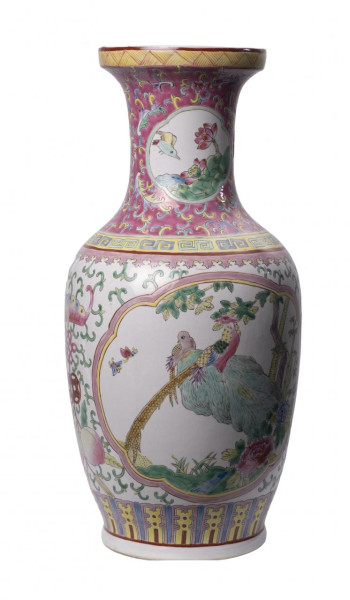 Jarrón "Familia Rosa" en porcelana esmaltada con decoración de pavos reales en cartelas y flores. China, S. XIX - XX