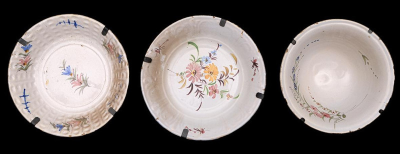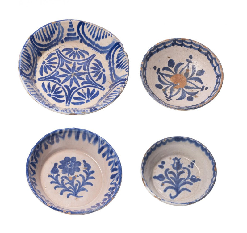 Lote compuesto por 4 platos hondos en cerámica de Fajalauza esmaltada en azul sobre fondo blanco. Granada, S. XIX - S. XX