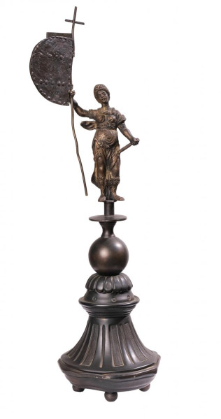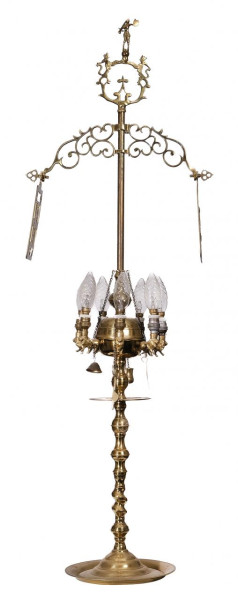 Velón o lámpara de aceite, en bronce, para siete mechas con pantallas laterales caladas. Fns. XIX