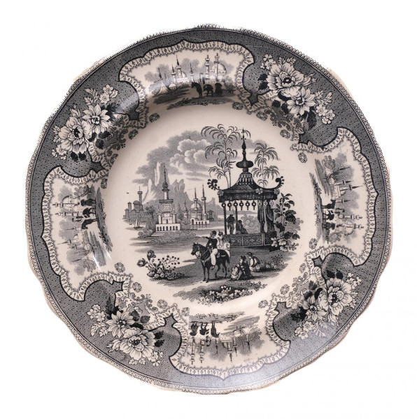 Plato en cerámica esmaltada con decoración transferida de paisajes orientales de Staffordshire William Adams IV & Sons de la serie "Palestina". Inglaterra, mediados del S. XIX