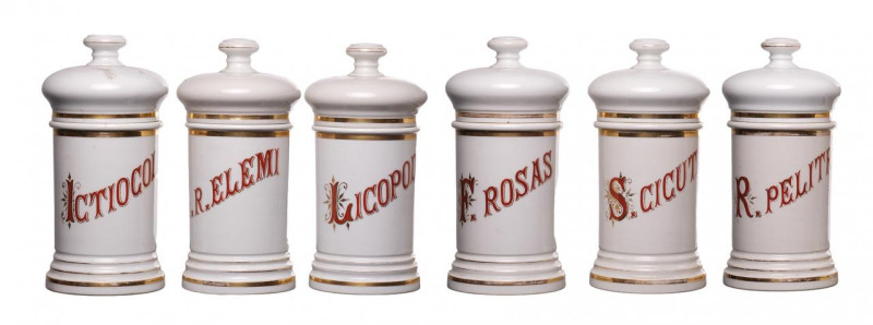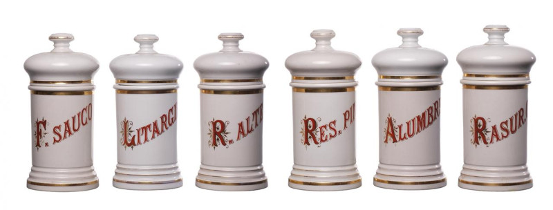 Lote formado por seis albarelos de farmacia en cerámica esmaltada con realces en dorado. Ppio. S. XX