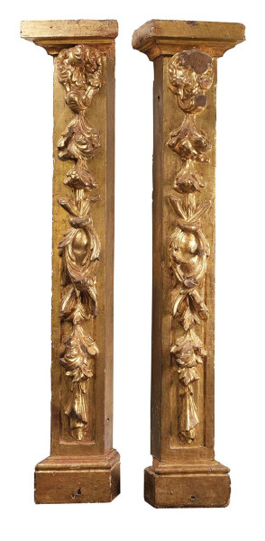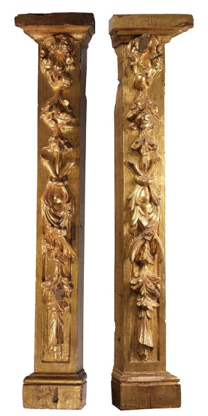 Pareja de pilastras de retablo en madera tallada y dorada con decoración de motivos vegetales. España, S. XVII