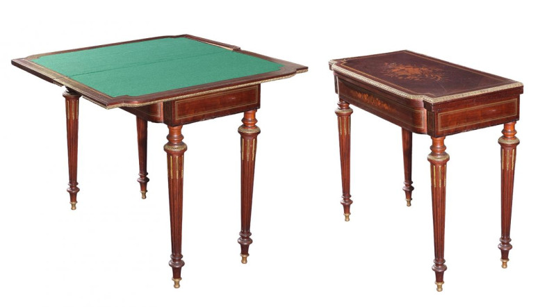 Mesa de juego Napoleón III en madera tallada y chapeada con marquetería de bouquets florales y guarniciones en bronce dorado. Francia, Fns. S. XIX