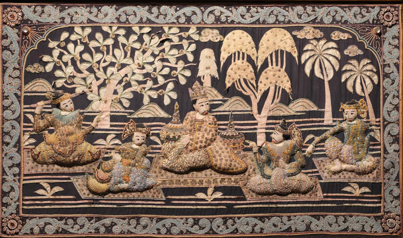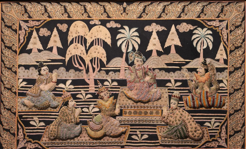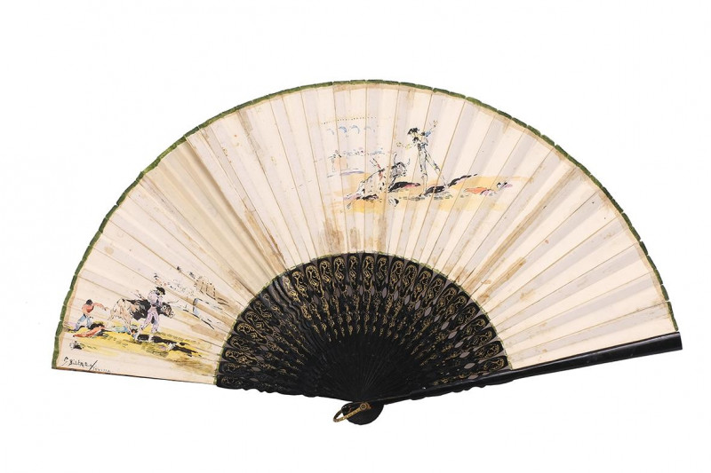 Espejo con marco en madera tallada, dorada y policromada con decoración de hojas de acanto y flores pintadas con cartelas con paisajes. España, S. XX