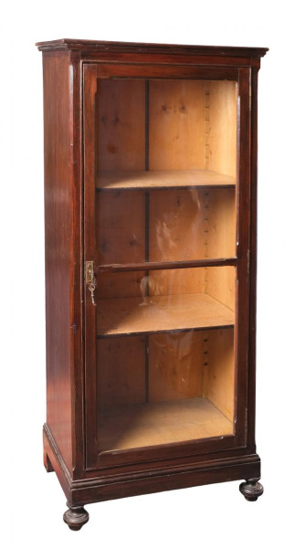 Vitrina en madera con puerta frontal acristalada de una hoja, interior compartimentado en dos alturas y pies torneados. España, Ppio. S. XX