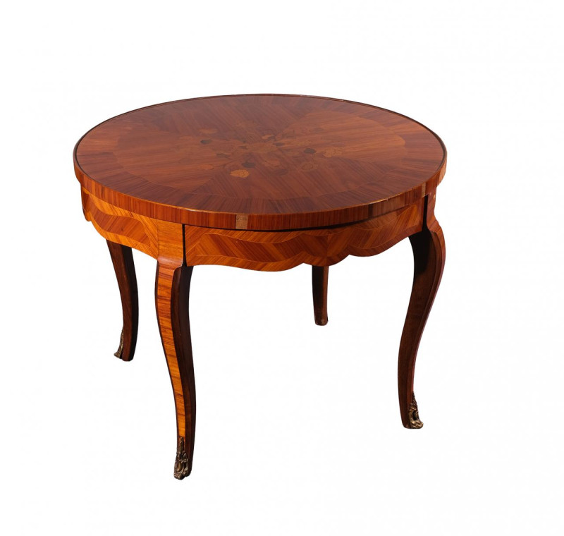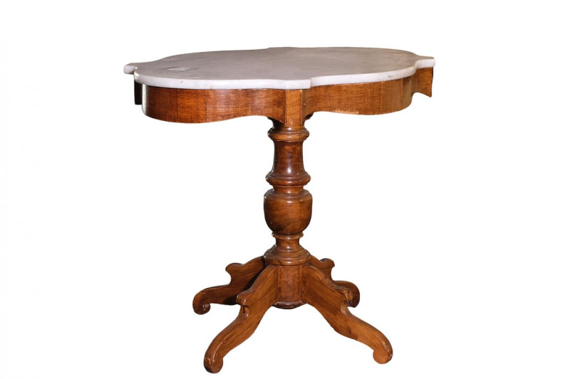 Mesa velador galápago isabelina en madera con pie central torneado y tapa en mármol blanco. España, 2ª mitad del S. XIX