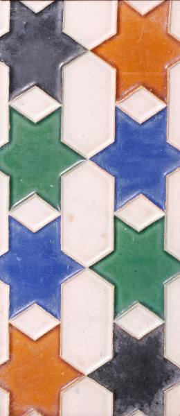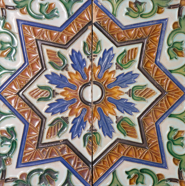 Azulejo en cerámica esmaltada de Pickman con decoración de estrellas en color azul, verde, negro y ocre sobre blanco realizado mediante la técnica de arista. Sevilla, S. XX