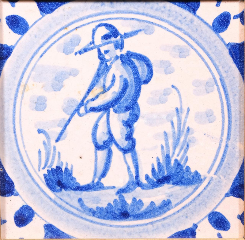Azulejo en cerámica esmaltada de Triana de Manuel García Montalván en azul y blanco con decoración central de cazador. Sevilla, S. XX