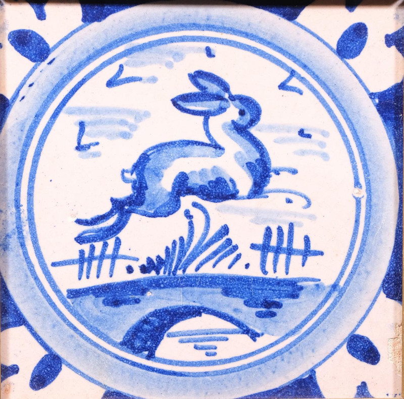 Azulejo en cerámica esmaltada de Triana de Manuel García Montalván en azul y blanco con decoración central de liebre. Sevilla, S. XX