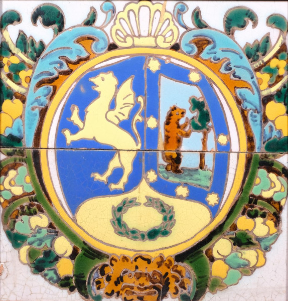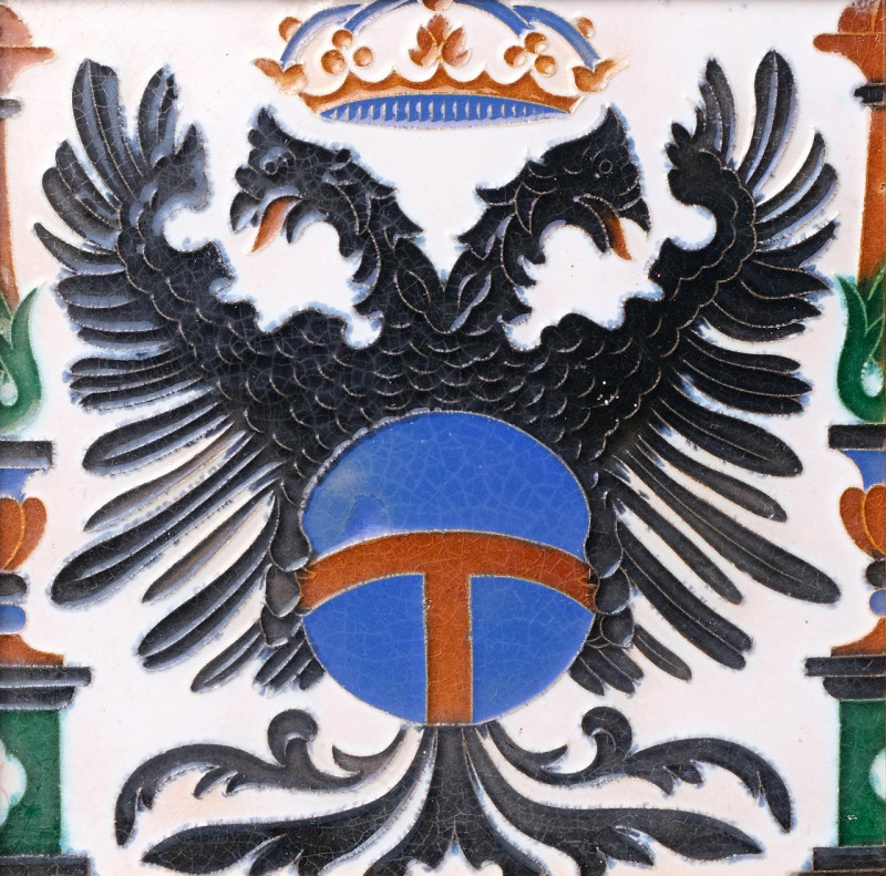 Pareja de azulejos en cerámica esmaltada polícroma de Triana de la casa Mensaque realizados mediante la técnica de cuerda seca con decoración de escudo. Sevilla, S. XX