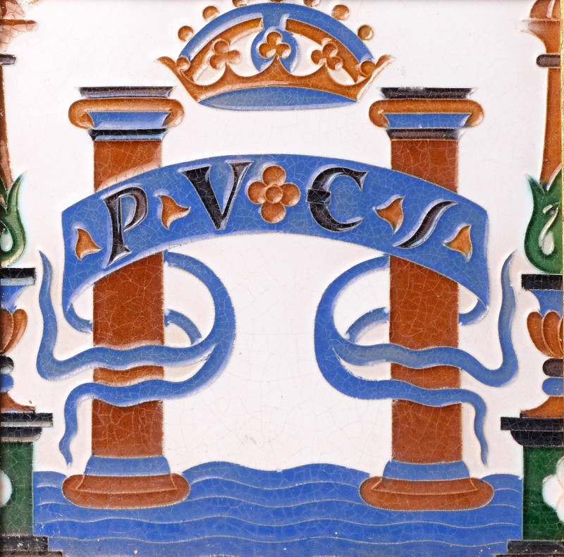 Azulejo en cerámica esmaltada polícroma de Triana de la casa Mensaque realizado mediante la técnica de cuerda seca con decoración de las Columnas de Hércules. Sevilla, S. XX