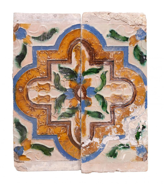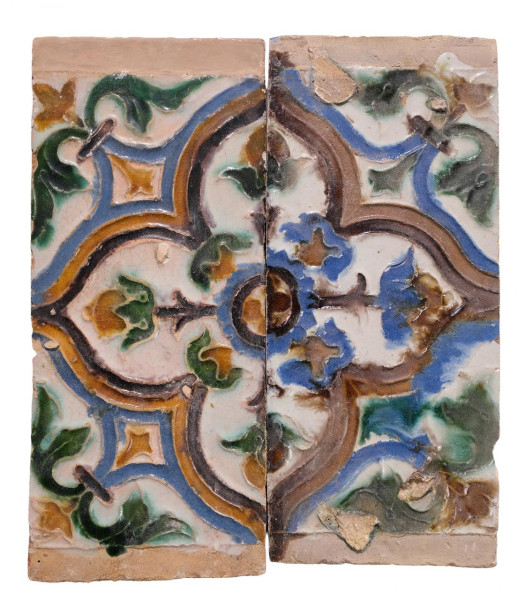 Pareja de azulejos por tabla en cerámica esmaltada de Triana en tonos azul, amarillo, verde y melado sobre fondo blanco realizado mediante la técnica de arista. Sevilla, S. XVI