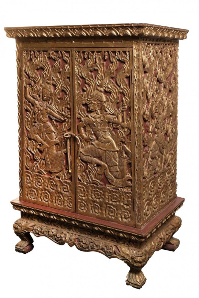 Mueble oriental en madera tallada y dorada con dos puertas frontales que albergan personajes. S. XX