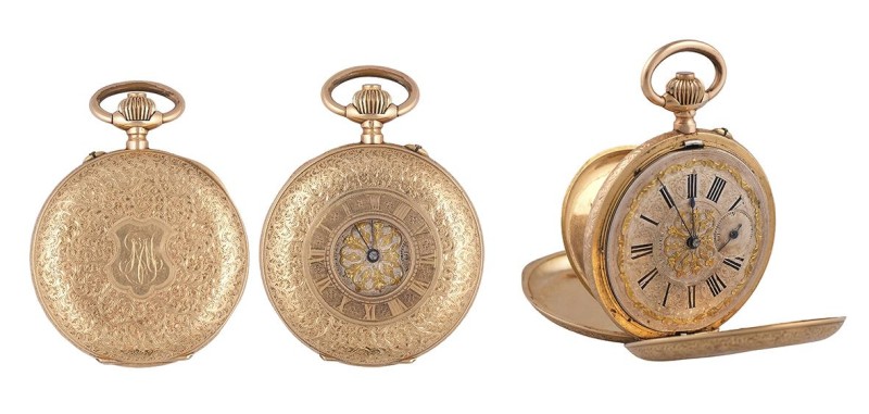 Reloj de bolsillo suizo tipo saboneta en oro amarillo de 18k. De tres tapas, presenta decoración detallada y delicada grabada a mano con motivos vegetales en la caja, guardapolvos firmado y numerado. En la tapa muestra número romanos y abertura.