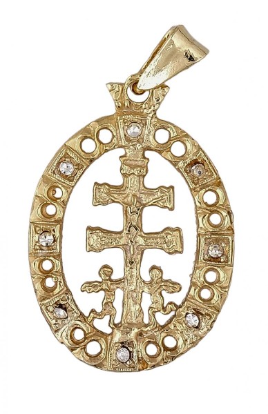 Cruz de Caravaca en metal dorado, orlada con pequeñas circonitas. Medidas: 3,5 x 2cm. Peso total de la pieza: 2,30g