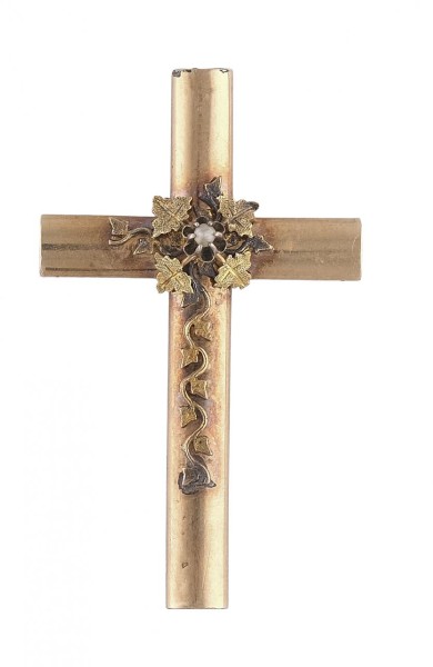 Cruz en oro de 14k con decoración de vid y pequeña perlita central. Medidas: 4,5 x 2,06. Peso total de la pieza: 3g