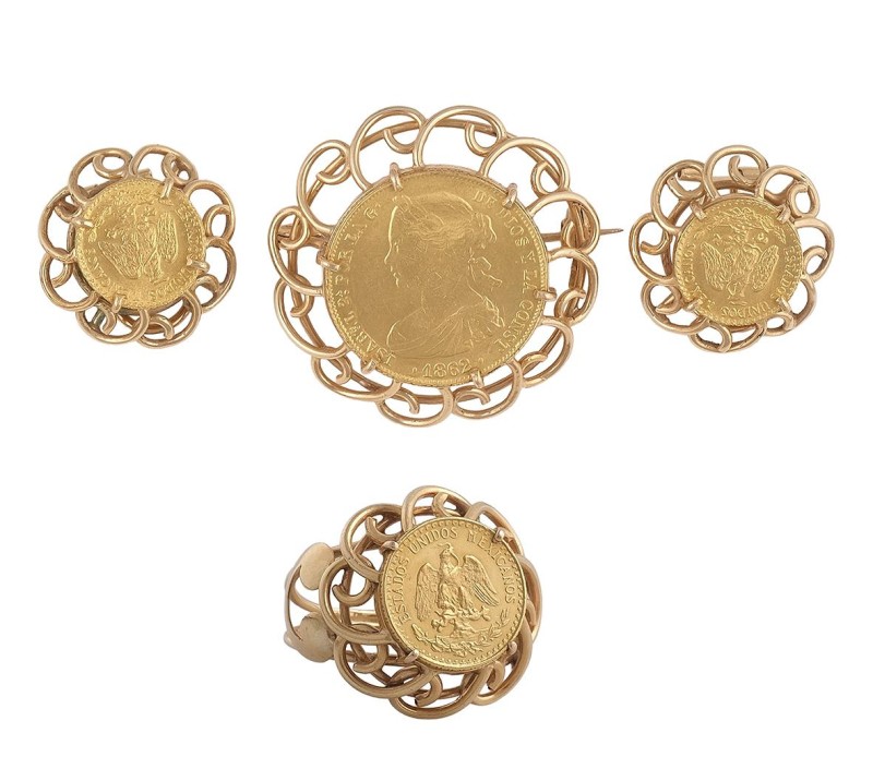 Conjunto de broche, pendientes y sortija en oro de 18k. Cierre omega. Sortija talla: 14. Peso total de las piezas: 33g.