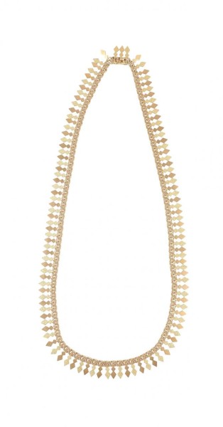 Collar en oro amarillo de 18k con eslabones en forma de barritas y frente con cinco flores con hojas talladas en hueso. Largo: 50cm. Peso total de las piezas: 21,30g