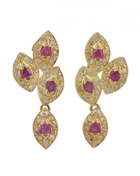 Pendientes con diseño de hojas en oro amarillo de 18k centros de rubíes talla pera de 0,67ct y orlados de diamantes talla brillante de 0,70ct. Cierre omega. Peso total de las piezas: 9,7g