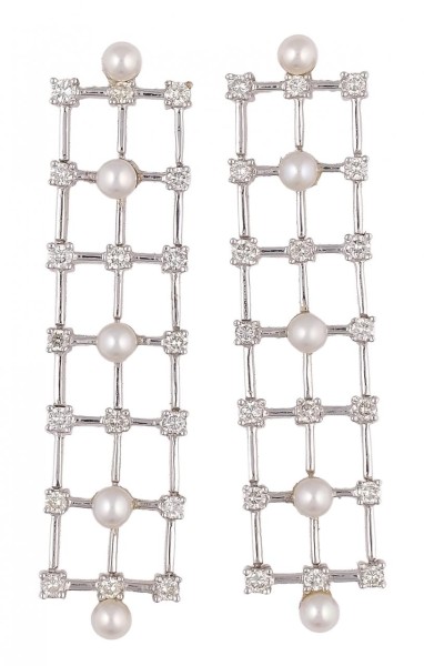 Pendientes largos en oro blanco con diseño de rejilla, diamantes de 1,28ct y pequeñas perlas cultivadas de 3,5mm. Cierre de presión. Peso total de las piezas: 14,75g