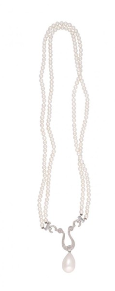 Collar de perlas en disminución de 14 a 11mm con cierre de reasa marinera en oro de 18k. Largo: 48cm