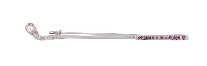 Alfiler en oro blanco en forma de palo de golf, ornamentada la empuñadura con rubíes y la cabeza con diamantes talla brillante y una pequeña perla cultivada. Peso total de la pieza: 3,89g