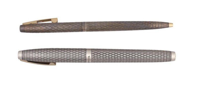 Pluma estilográfica y bolígrafo Sheaffer Imperial Sovereign chapados en plata, decoración con patrón de diamantes tallados, y con plumín en oro de 14k. H.1970. El plumín está inscrito con "Sheaffer", "14 karat" y "USA".