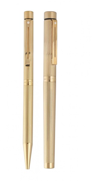Juego de pluma y bolígrafo Sheaffer TRZ modelo n.º 70, chapados en oro de 18k. Estética de líneas limpias. Fábrica estadounidense, h. 1980. Estuche original.