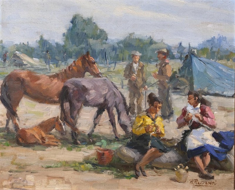 Escena rural con personajes y caballos