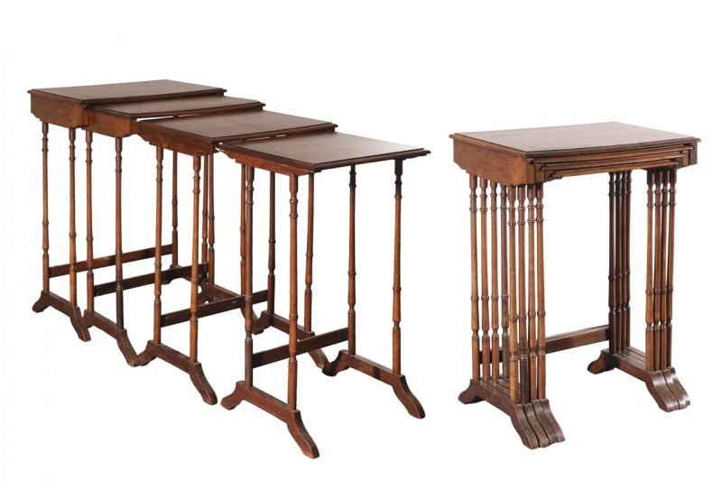 Cuatro mesas nido en madera con sobre con chapeado de motivos geométricos en diferentes maderas y patas torneadas. Mediados del S. XX